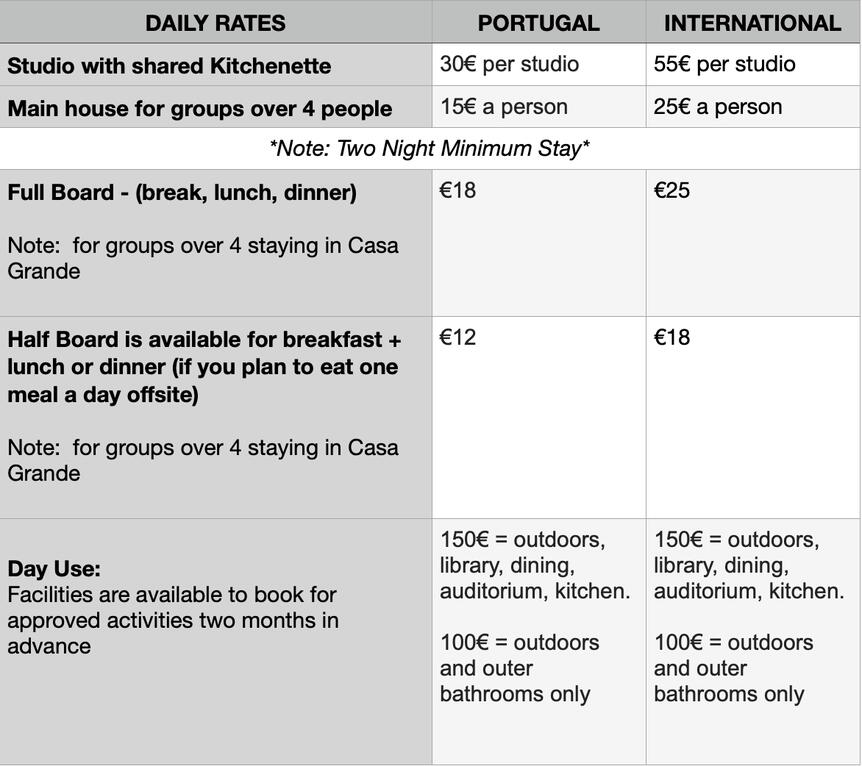 Your reservation is confirmed when 50% is received. The remaining amount is due one week before your stay.• The Professional Kitchen is not available for self-serve access.• Group Retreats are for college-age 18 and above. Children are welcome with family stays and must be supervised by an adult at all times.• Accompanied children up to 12yrs old are half price. Under 3yrs old are free.• The main rooms and bedrooms are heated during winter months. We do not have indoor air conditioning in the summer.• Wifi is available for free in the Casa Grande / Library. Available in the Studios for 5€ a day / 20€ a week.• Full or Half Board must be confirmed with at least a week's advance notice for your group.CANCELATIONS: